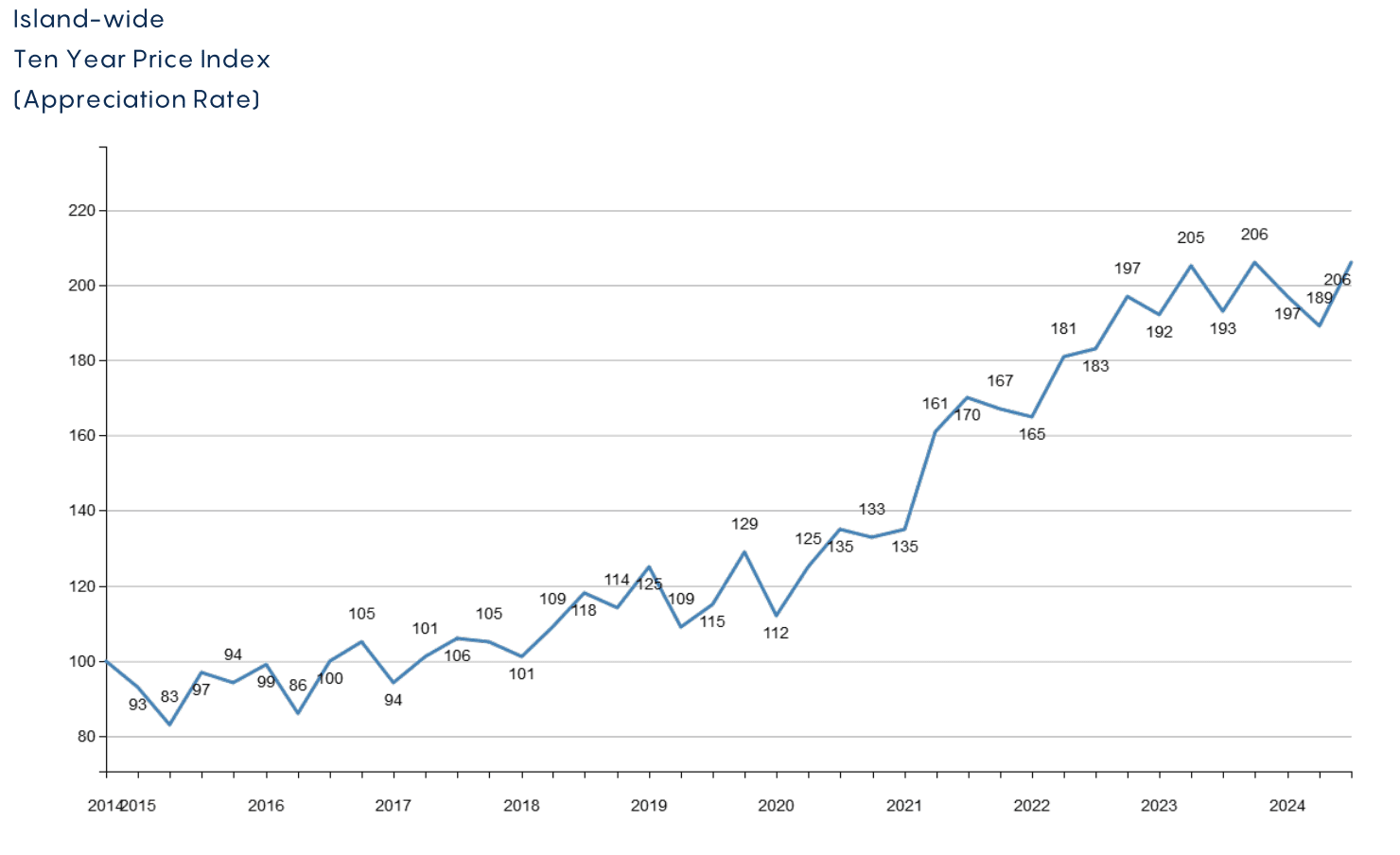 Next, this graph displays a 10-year price trend for Island homes, reinforcing that prices haven’t decreased. As you can see, there was steady appreciation before the pandemic, followed by a substantial increase during it. Over the last two years, prices have leveled off, but they haven’t declined. This stability reflects the Island’s enduring appeal and limited inventory.