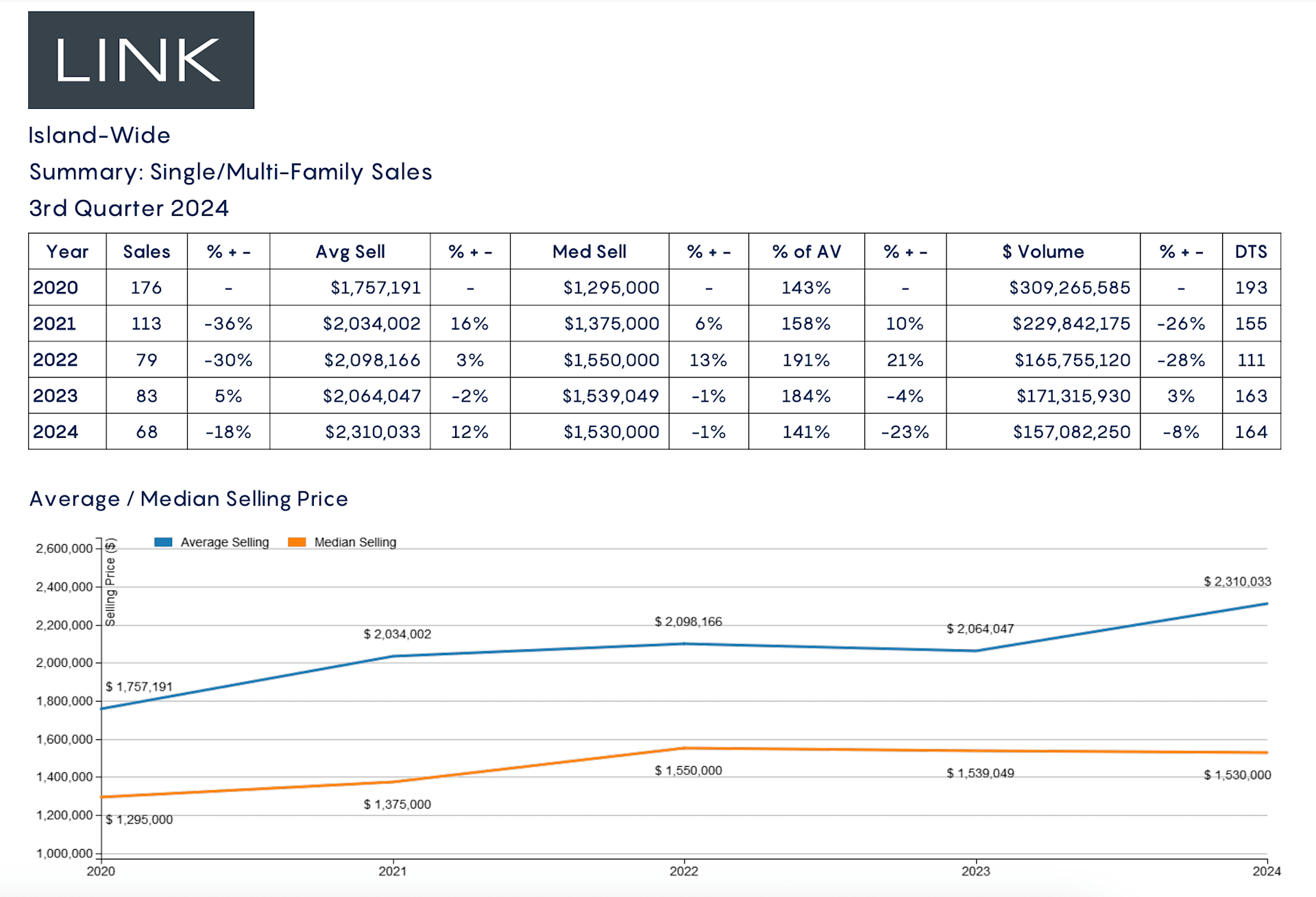 This chart from LINK’s 3rd Quarter Sales Summary illustrates a significant decline in the number of sales (see the first column) alongside three consecutive years of steady median prices. This stability shows that, even with fewer transactions, home values on the Island have remained strong since 2022.