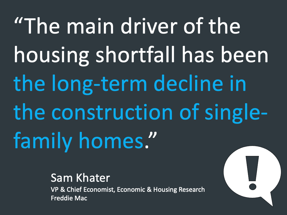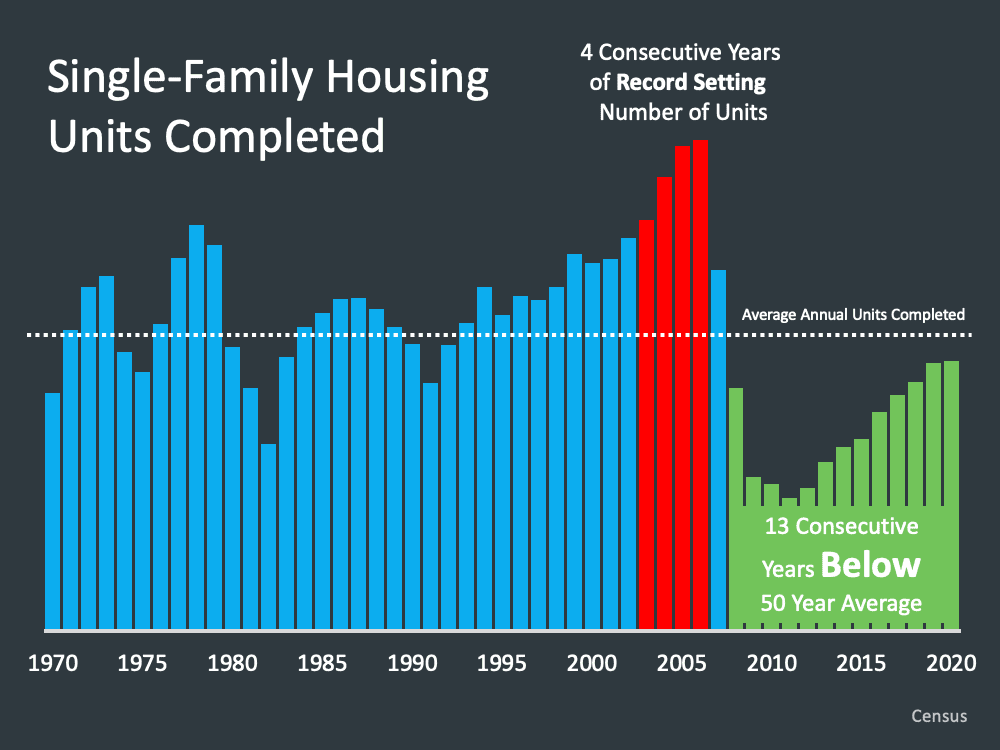 Secondly, the main factors in the current price run-up are tight supply and strong demand, not sloppy lending. Take a look at the graphic here that shows the drop in construction over the last ten years. Many think the boom has been years in the making. Having overbuilt in the 2000s, homebuilders under built in the 2010s—and now, it's playing catch up.